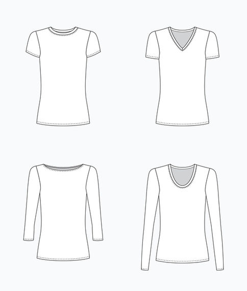 the Lark Tee is your closet’s new best friend. It’s great on its own or under your favorite button up, sweater, or blazer. All four sleeves are interchangeable with each of the necklines resulting in 16 potential different tees in one pattern!