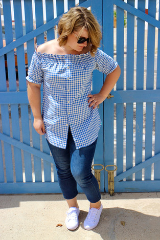 During the sew-alongs, I made 2 off the shoulder tops. We refashioned an old man's shirt into a summery off the shoulder top. We also sewed beach/pool cover ups in the last session.